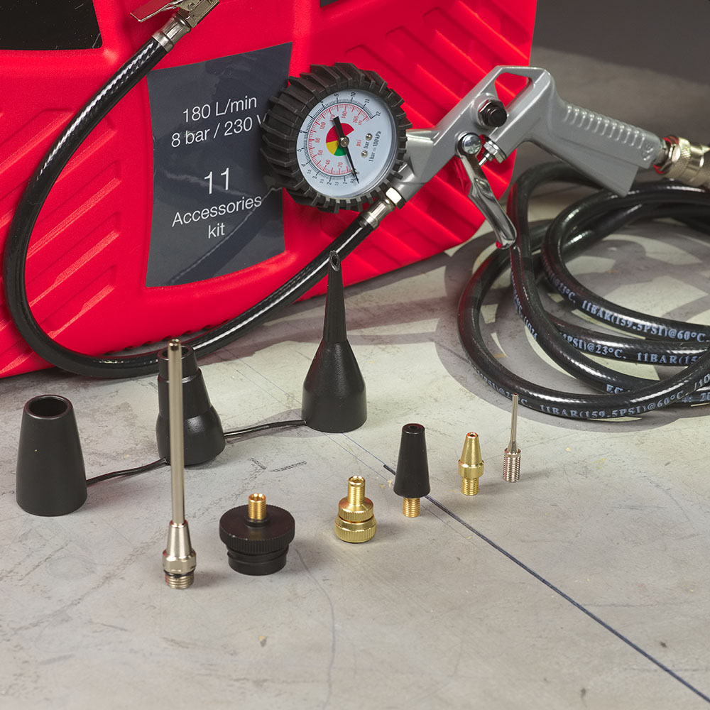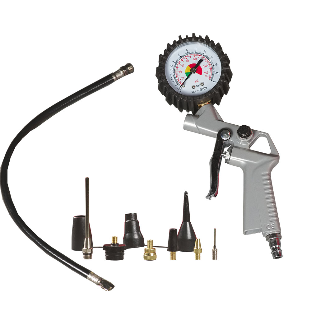 Пневмопистолет с манометром для накачки, Удлиненная насадка для продувки, Игла для накачки мячей, Универсальный адаптер для клапанов с внутренним диаметром 6 мм, Универсальный адаптер для клапанов с внутренним диаметром 9 мм, Адаптер для накачки велосипедных шин, Насадки для накачки лодок, матрасов, бассейнов, Переходник (для насадок накачки лодок, матрасов, бассейнов), Воздушный шланг 3 м |