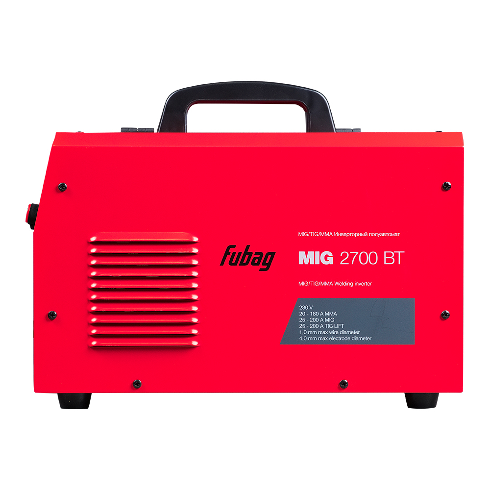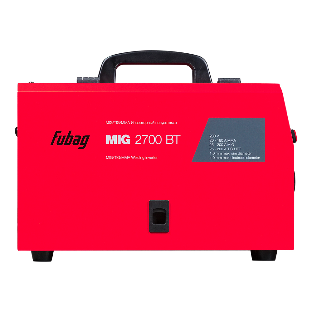Сварочный инвертор FUBAG MIG 2700 BT – высокопроизводительный сварочный полуавтомат 4 в 1, оптимален для проведения широкого спектра сварочных работ в режиме полуавтоматической, ручной дуговой и TIG LIFT сварки. Аппарат позволяет проводить сварку в режимах MIG/MAG (с газом – СО2 или смесь), FLUX (без газа), ММА, TIG LIFT. Полностью готов к работе благодаря встроенной горелке. Сварочный полуавтомат FUBAG MIG 2700 BT работает в диапазоне тока 20-180А в режиме MMA, 25-200А – в режиме MIG/MAG с газом омедненной проволокой диаметром 0,8-1,0 мм с катушкой до 5 кг/200 мм, флюсовой проволокой с катушкой 1 кг (без газа) диаметром 0,8-0,9 мм и 25-200А – в режиме TIG LIFT.