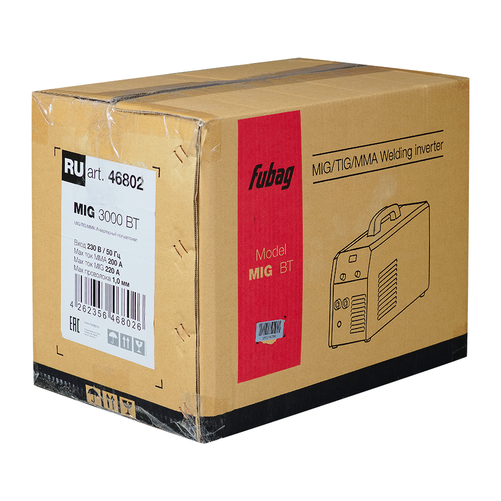 Сварочный инвертор FUBAG MIG 3000 BT – высокопроизводительный сварочный полуавтомат 4 в 1, оптимален для проведения широкого спектра сварочных работ в режиме полуавтоматической, ручной дуговой и TIG LIFT сварки. Аппарат позволяет проводить сварку в режимах MIG/MAG (с газом – СО2 или смесь), FLUX (без газа), ММА, TIG LIFT. Полностью готов к работе благодаря встроенной горелке. Сварочный полуавтомат FUBAG MIG 3000 BT работает в диапазоне тока 20-200А в режиме MMA, 25-220А – в режиме MIG/MAG с газом омедненной проволокой диаметром 0,8-1,0 мм с катушкой до 5 кг/200 мм, флюсовой проволокой с катушкой 1 кг (без газа) диаметром 0,8-0,9 мм и 25-220А – в режиме TIG LIFT.