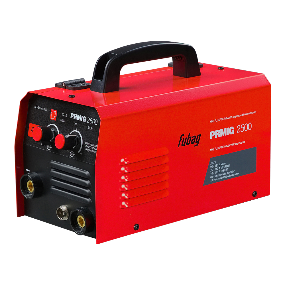 Сварочный инвертор FUBAG PRMIG 2500 – высокопроизводительный сварочный полуавтомат 3 в 1, оптимален для проведения широкого спектра сварочных работ: полуавтоматическая сварка FLUX (без газа), ручная дуговая и TIG LIFT сварки. Аппарат позволяет проводить сварку в режимах FLUX (без газа), ММА и TIG LIFT. Сварочный полуавтомат FUBAG PRMIG 2500 работает в диапазоне тока 20-180А в режиме MMA, 25-140А флюсовой проволокой с катушкой 1 кг (без газа) диаметром 0,8 - 0,9 мм и 10-140А - в режиме TIG LIFT.