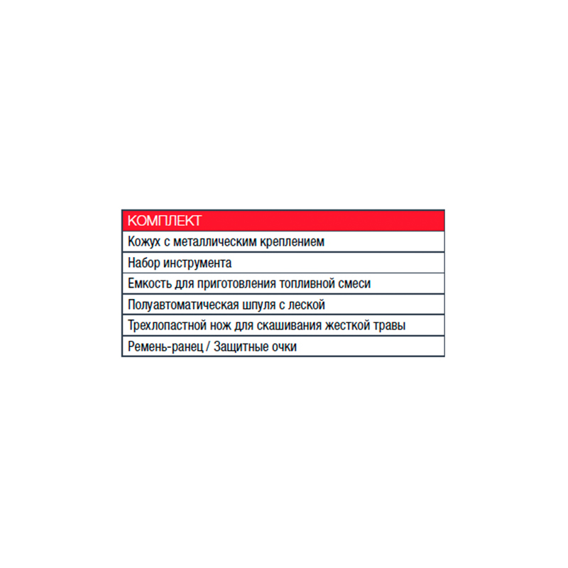 Набор инструментов , Очки, Канистра для бензосмеси, Стальной триммерный трехлопастный нож, Полуавтоматическая шпуля (облегченная заправка) с леской (посадка М10-1,25 мм) |